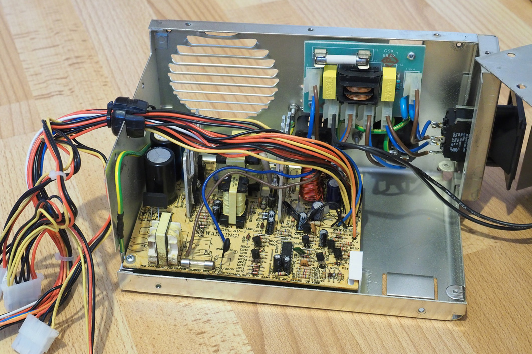 Bei einem der beiden IBM PCs, die ich vor ein paar Wochen bekommen habe, war das Netzteil defekt. Da ich auf eine Fehlersuche nicht wirklich Lust hatte, habe ich mich dazu entschieden, die Schaltplatine eines AT-Netzteils samt Kabelbaum zur Reparatur zu verwenden. Das hat auch gleich den Vorteil, dass das Netzteil danach 200 Watt liefert und mehr Molex-Stecker zur Verfügung stehen.