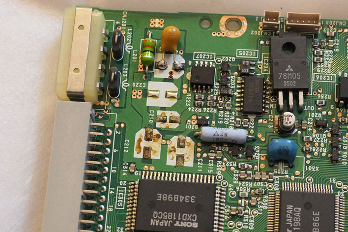Als ich eines der Laufwerke zerlegt und mir die Platine angesehen hatte, war schnell klar, wo das Problem liegt: Es wurden billige SMD-Becher-Elkos verbaut, wie man sie auch vom Amiga 600/1200 und CD32 kennt. Alle neun waren ausgelaufen, und zwar bei allen drei Laufwerken! Nach dem Austausch der Elkos und Reinigung der Platine liefen alle drei Laufwerke wieder wie am ersten Tag.
