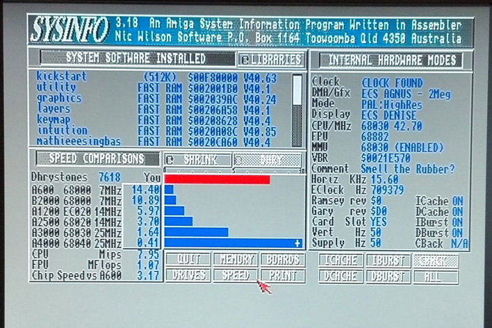 Auf USB habe ich nach gründlicher Überlegung verzichtet, so auch auf eine Aufrüstung der M-Tec T-630 auf 8 MB Fast-RAM, da ich keine eindeutigen Infos dazu finden konnte, wie sich das auf den PCMCIA-Slot auswirkt. Wie geplant habe ich jedoch ein MP3@64-Modul verbaut, so dass der A600 im Hintergrund MP3-Dateien abspielen kann. Hierzu nutze ich AmigaAMP mit einem MHI-Wrapper. Der Ton wird direkt über die Audio-Ausgänge des Amigas ausgegeben. Dank der Indivision ECS kann der A600 ohne Umwege direkt an einem VGA-Monitor betrieben werden. Auch die SysInfo-Werte können sich sehen lassen. :)